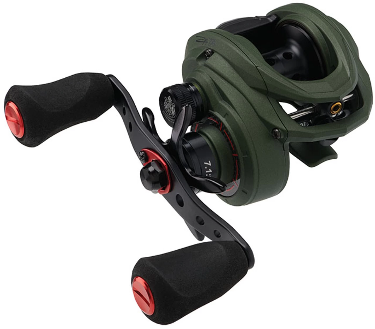 Built to serve tournament anglers and weekend warriors equally well, the Abu Garcia Zata Baitcasting Reels offer dependable performance from a sleek and compact design. The Zata is built around a lightweight yet highly rigid graphite frame and sideplate, and is equipped with an ergonomically bent handle and drag star to provide a streamlined and easily palmable package. Equipped with Abu Garcia’s Carbon Matrix drag system, the Zata is capable of stopping any bass dead in its tracks with up to 20 lbs of smooth peeling drag pressure. At the Zata’s core is a Duragear brass main gear that provides a silky smooth retrieve that will stand the test of time. With a highly adjustable Infini-brake magnetic braking system, anglers can expect optimal casting performance with a wide variety of baits in all conditions. Finally, the reel’s one-of-a-kind olive drab finish with black and red accents give it a signature styling that any outdoorsman can appreciate.